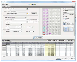 The LabSolutions Quick Batch window displays the sample rack mounted on the system. You can create batch files while checking the vial positions in thewindow..