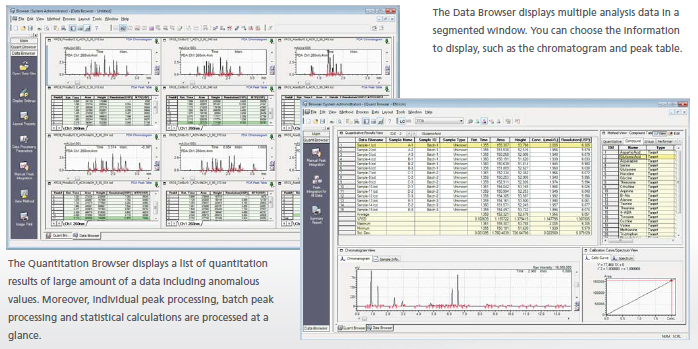 The Data Browser and Quantitation Browser in LabSolutions incredibly accelerate the comparison of multiple analytical data and processing of all quantitation results. Large amounts of data are intuitively handled by the drag-and-drop data loading and automated data loading from batch files.
