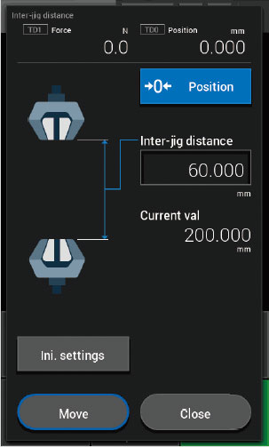With the intelligent crosshead function, the crosshead moves to ensure a user-defined jig separation. The jig separation is constantly monitored to prevent impacts between jigs. (The jigs must be pre-registered.) Additionally, the jig separation movement can be performed automatically in accordance with the test conditions by interlinking it with TRAPEZIUMX-V.