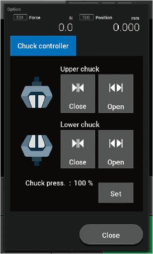 Using a hand-held controller, both pneumatic and hydraulic type grips can be opened and closed automatically. This controller improves productivity since everything needed to prepare for measurements, from crosshead movement and testing conditions settings to hydraulic adjustments, can generally be implemented.