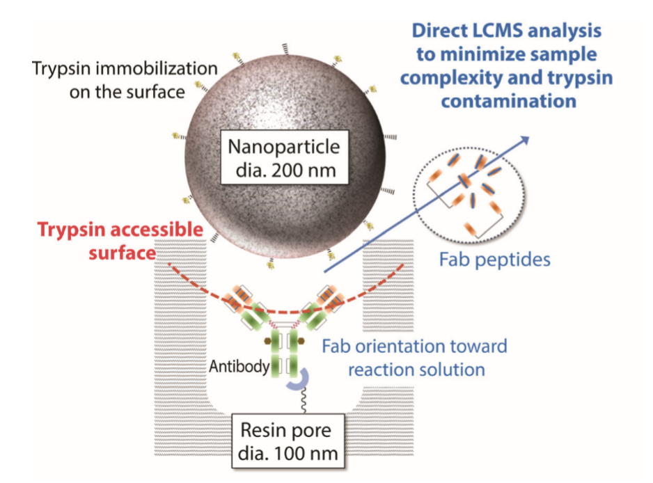 nSMOL (nano-surface and molecular orientation limited proteolysis) is Shimadzu’s proprietary, innovative technique that enables selective proteolysis of the Fab region of monoclonal antibodies. The nSMOL Antibody BA Kit is a ready-to-use reagent kit for collecting monoclonal antibodies from blood or other biological samples using immunoglobulin collection resin, and then performing selective proteolysis of the Fabregion of these antibodies via trypsin-immobilized nanoparticles. Variable region-derived peptides produced by limited proteolysis can then be quantified via MRM measurements utilizing a high-performance LCMS-8050/8060 triple quadrupole liquid chromatograph mass spectrometer.