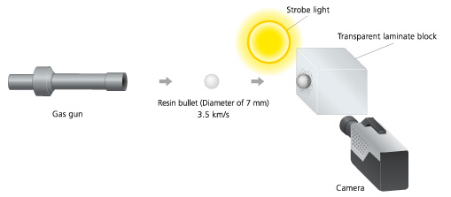 A resin sphere is injected at 3.5 km per second from the gas gun. The high-speed collision of a transparent laminate with the resin sphere is captured in the backlight system to face the camera and strobe light.