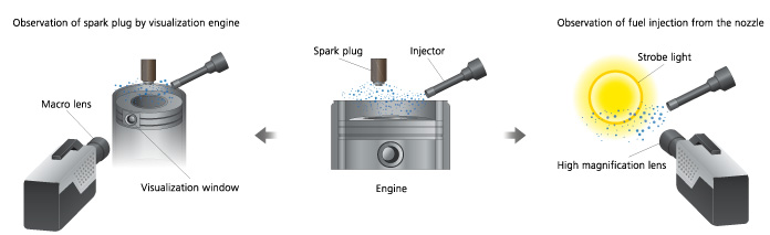In order to develop high-output, high-efficiency automobile engines, detailed observations and analyses of the structural components of the engine are required. This includes the process of fuel injection by fuel injection equipment (injectors), and the process of fuel ignition by spark plugs. In addition, the development of automobile bodies utilizing new materials such as lightweight and very strong carbon fiber reinforced plastics (CFRP) is actively being pursued. However, in developing such new materials, it is necessary to observe and analyze the deformation and failure behavior of materials when they undergo an impact. In recent years, the deformation behavior of materials recorded using high-speed cameras has been analyzed using image analysis software. Dynamic analyses of the 2D or 3D strain distributions in the material are also performed. In addition, high-speed cameras are used to observe the engine combustion process and the behavior of airbags.