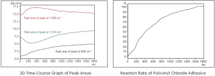 Time-course measurement also permits the graphic display of absorption changes in peaks of interest as 2D time-course data. We calculated the curing reaction rate assuming a reaction rate of 0 % at the start of measurement and the completion of the curing reaction 30 minutes later.