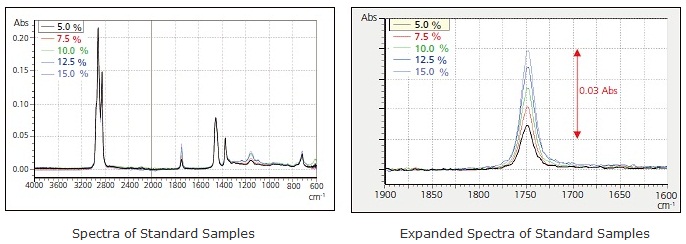 First, to generate the calibration curve, commercially available rapeseed oil was added to liquid paraffin to prepare standards at concentrations of 5.0, 7.5, 10.0, 12.5 and 15.0 % (mass fraction %) according to the JIS procedure. The standard oil samples with different concentrations were thinly coated on the ATR prism, and the spectra were measured.