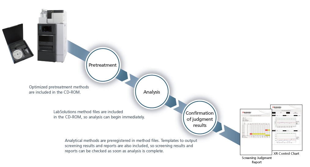 i-Series Solutions Package is a method package that encompasses pretreatment methods, analytical conditions, and printout of judgment results. The kit supports workflow automation with a CD-ROM containing optimized pretreatment methods and analytical conditions for target components, and analytical columns that allow for sample analysis immediately after purchase.