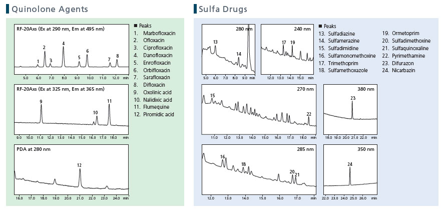 Synthetic antimicrobials are types of veterinary drugs and food additives, and residue levels of these antimicrobials are specified to avoid adverse effects on health. With a pretreatment method that minimizes the influence of contaminant components in meat (muscles of beef, pork, and chicken), the synthetic antimicrobial screening system enables screening of 24 synthetic antimicrobials in meat that are identified as regulated substances in Japan and Europe.