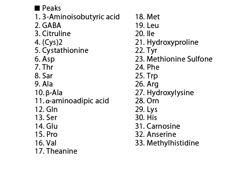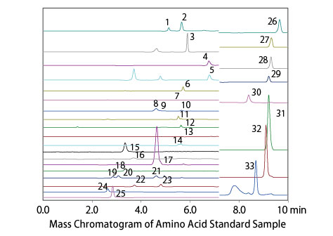 In amino acid analysis via HPLC, a long analysis time is required in order to separate the amino acids. When detecting by mass, however, the analysis time can be shortened while avoiding the impact of impurities.