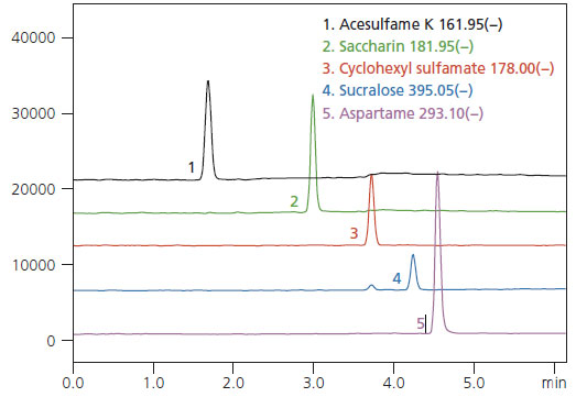 Low-calories sweeteners are now widely used in food products. Sweeteners exhibit distinct flavors different from sucrose and glucose, so flavors are adjusted by combining multiple sweeteners or other methods. This publication shows the results of an analysis of carbonated beverages and a mixed standard solution of synthetic sweeteners utilizing the i-Series Plus and the LCMS-2020. Sucralose is known for its poor light absorption, which makes it a difficult component to detect using a UV detector. In contrast, the LCMS-2020 can easily analyze these sweeteners.