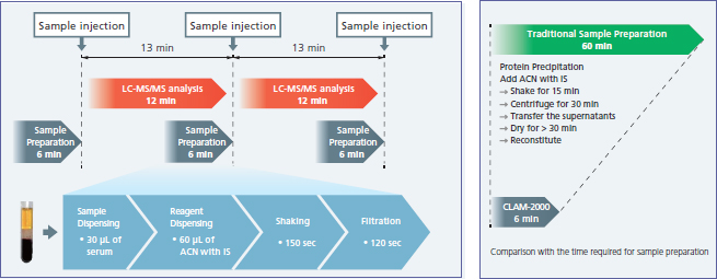 This analysis flow is an example of a simultaneous multicomponent analysis of steroids in serum using a fully automated preparative LCMS analysis system consisting of a Nexera X2 Ultra High Performance Liquid Chromatograph, LCMS-8060 Triple Quadrupole Mass Spectrometer, and CLAM-2000 fully automated sample preparation module for LCMS.