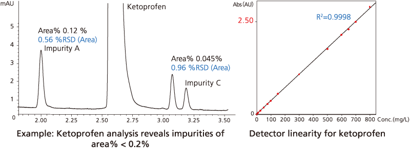 The SPD-M40 detector achieves an extremely high level of sensitivity and linearity (up to 2.5 AU). This allows quantitation of very lowconcentration impurities even in high-concentration samples. The UV cut-off filter installed in the detector prevents sample degradation due to UV light, helping to maintain good linearity at low concentrations. (Pat. Pending)