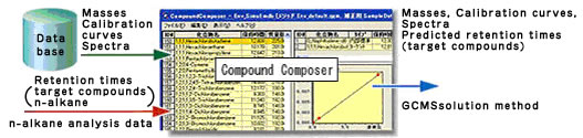 The Compound Composer extracts the target masses, mass spectra, calibration curves and other information required for quantitation of components of interest, and genertes a GCMSsolution method. It also predicts the retention times of target components using the n-alkane retention time information in the database together with the n-alkane measurement data acquired under the instrumental conditions in use, thereby enabling their identification and quantitation using GCMSsolution even without specifying other conditions. In addition, data on substances for verifying the instrument performance is also registered in the database. Please refer the Analysis Flow Chart using the Compound Composer Database Software for simultaneous analysis.