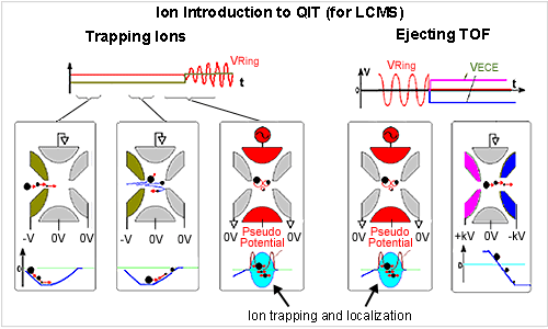 The ion optical system used in the LCMS-IT-TOF leads to a novel ion introduction method referred to as Compressed Ion Introduction or CII, where the combination of the skimmer, octopole and first lens converts the continuous stream of ions into pulses for introduction into the ion trap. This method makes it possible to control the accumulation of ions before they are introduced into the ion trap, allowing the RF to be applied to the ring electrode at the instant that all of the CII-accumulated ions enter the ion trap. This new method of controlling the ion trap, which is quite different from a traditional ion trap, is adopted for the LCMS-IT-TOF. The development of this CII effectively couples the LC system to the MS and enables a dramatic improvement over the previously deficient ion capture rate of the ion trap, thereby increasing sensitivity.