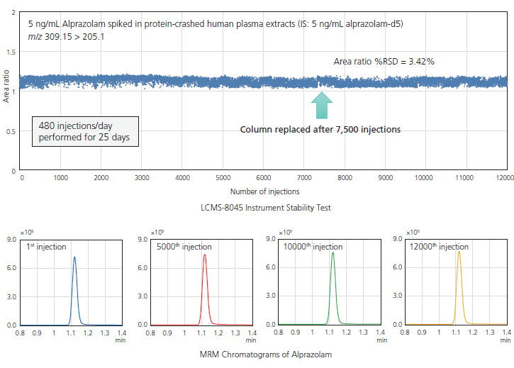 Shimadzu's MS interface includes a high-sensitivity heated ESI source, heated capillary sample introduction, and proprietary ion transfer optics. These design features combine to produce robust MS performance. 12,000 plasma samples were injected over 25 days (over 480 samples per day). Picogram levels of alprazolam were analyzed with an RSD of 3.42%.