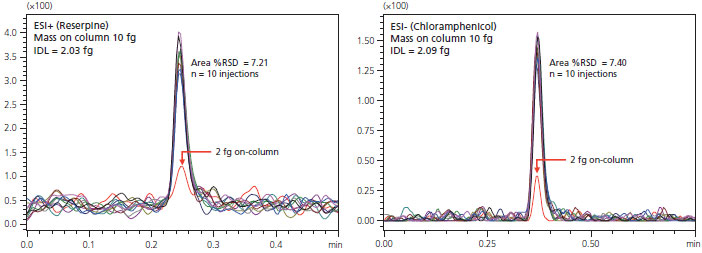 IDL is one measure of sensitivity for analytical instrumentation. The chromatograms below show the IDL for Reserpine and Chloramphenicol, obtained using ESI+ and ESI-, respectively. The IDL for Reserpine is 2.03 femtograms and 2.09 femtograms for Chloramphenicol.