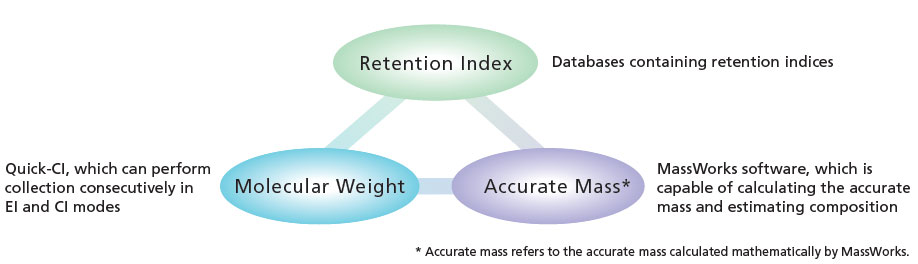 The MassWorks software calculates the theoretical accurate mass from the quadrupole MS mass profile. It then outputs candidate compositional formulas based on isotopic ratios and the theoretical accurate mass. This software is useful for estimating the composition of compounds that are not registered in a mass spectral library. The GCMSsolutionâ„¢ software can simultaneously output GC/MS data and mass profile data. The majority of compounds detected with the GC/MS data can be identified from a mass spectral library. MassWorks is then used to estimate the composition of any compounds that are not identified, further increasing the quality of the qualitative analysis.