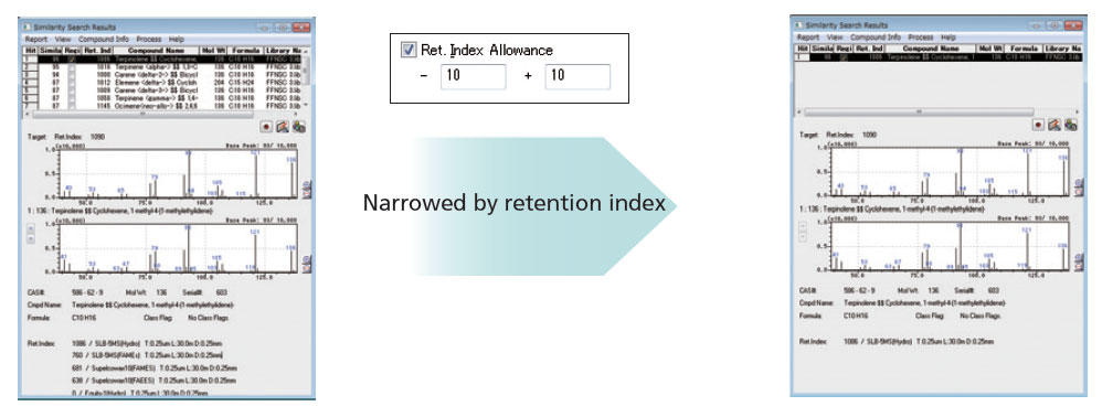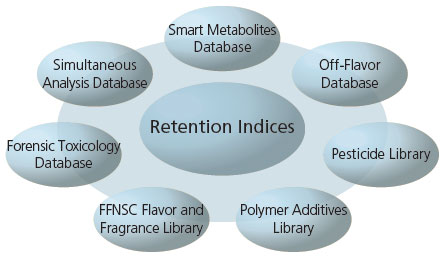 Databases are available with retention indices specific to a variety of application fields, including foods, chemistry, fragrances, forensics, and metabolite component analysis. In addition to mass spectra, searches are performed in combination with retention indices, which are very highly compound specific, so isomers and compounds with similar structures are accurately identified.