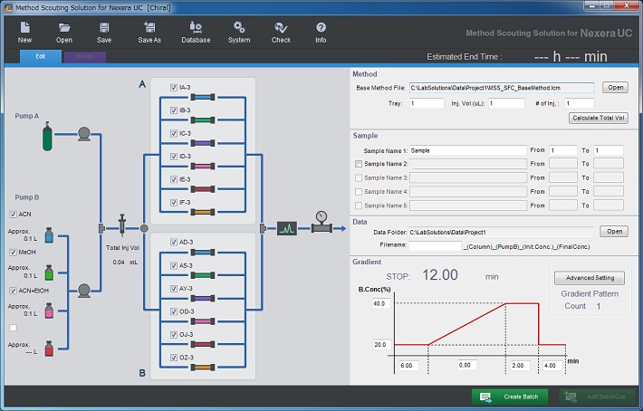 The high-speed performance of SFC can shorten the time required for method scouting. It automatically generates a large number of methods by utilizing combinations of up to 12 columns, four modifiers, and a different ratios of modifiers to mobile phase.