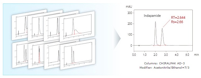 CHIRALPAK® Series and CHIRALCEL® Series columns (Daicel Corporation) for chiral analysis are capable of resolving a wide variety of compounds by showing complementary separation targets. The combination of the Nexera UC Chiral Screening System and these columns simplifies method scouting for chiral analysis.
