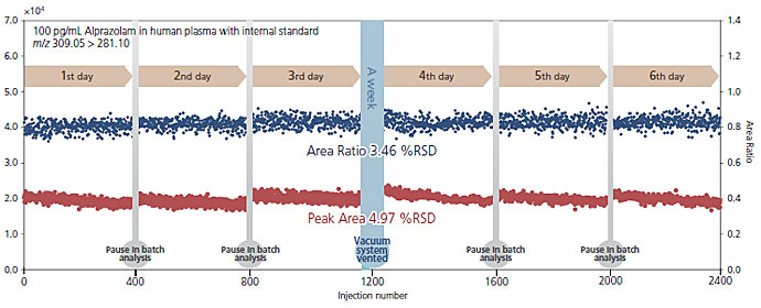 The robustness of the LCMS-8060 and modified ion optics was also assessed by injecting 2400 samples of femto-gram levels of alprazolam spiked into protein-precipitated human plasma extracts over a 6 day period (over 400 samples were injected each day). The RSD of peak area response was 5% over this test period, using a deuterated internal standard (alprazolam-d5) the RSD was 3.5%. As part of the robustness test the vacuum system was vented to model a transient power failure with no effect on signal response or baseline noise level.