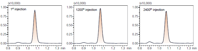 MRM chromatograms for the 1st, 1200th and 2400th measurements of alprazolam
