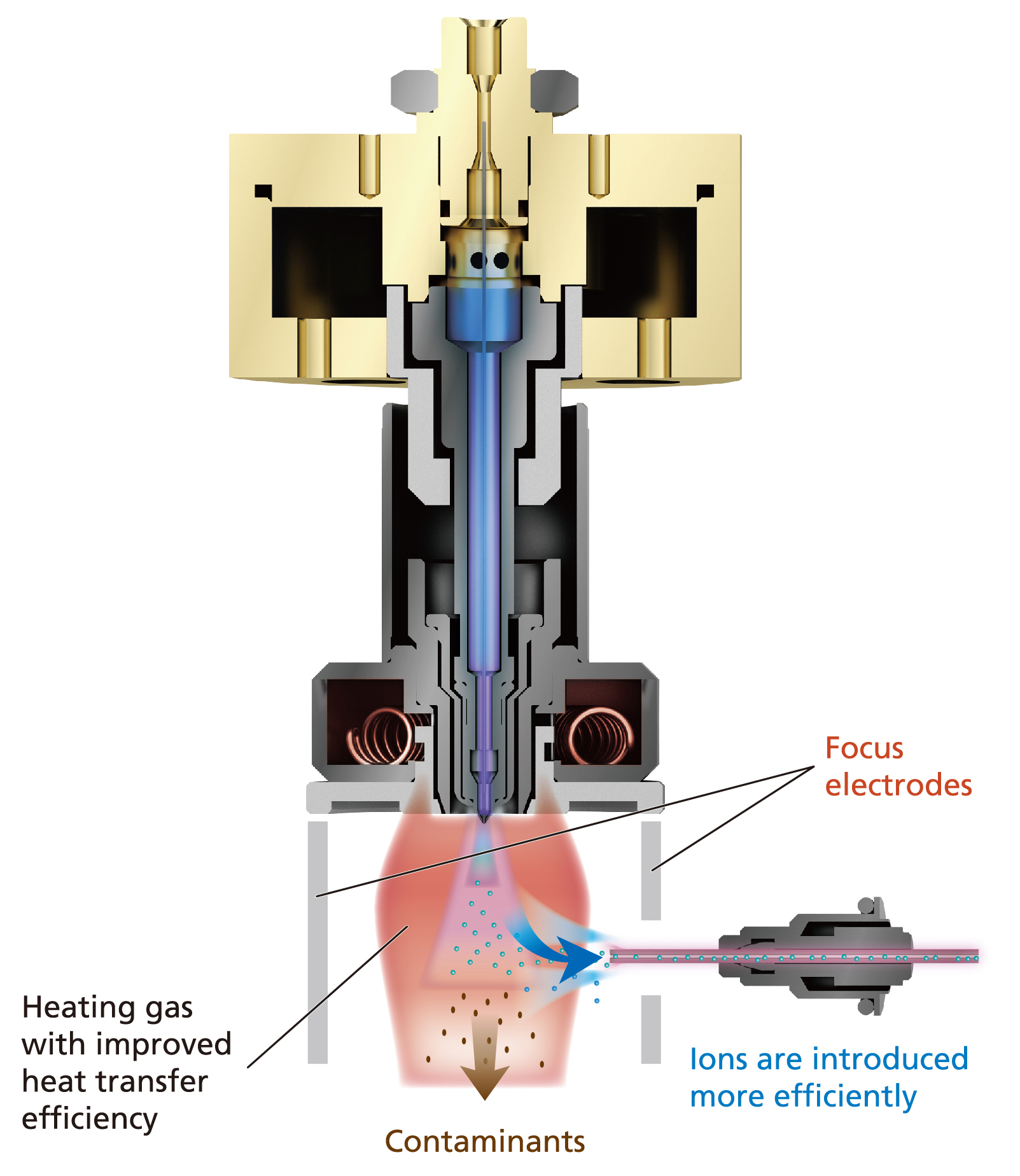 With the new IonFocus unit, In-built ESI probe with an improved heat-assist design, it increases desolvation efficiency and promotes the ionization of a wide range of compounds. In addition, newly-developed ion transport electrodes introduce ions into the mass spectrometer more efficiently, while expelling neutral particles to reduce noise and provide more stable data.
