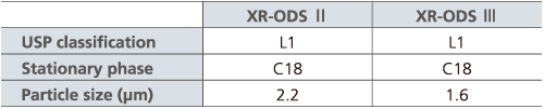 Although the Shim-pack XR ODS II has a particle size of 2.2 μm , it can be used up to a pressure of 60 MPa, making it appropriate for a wide range of analysis. The particle size of the XR-ODS III column has been reduced to 1.6 μm . With a maximum pressure of 100 MPa, it achieves high separation even with a short column length. These columns are suitable for shortening analysis times while taking full advantage of the high separation power of UHPLC.