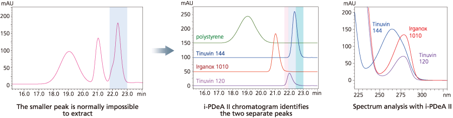 The i-PeakFinder tool can automatically recognize peaks even in complex chromatograms with high noise, and accounts for baseline drift for higher integration accuracy. Adjustable parameters in i-PeakFinder, such as peak detection threshold, allow the user to detect smaller peaks. In addition, the i-PDeA II function can quantify peaks that cannot be completely separated by a column. Separate peaks by simply specifying the time and wavelength in LabSolutions.