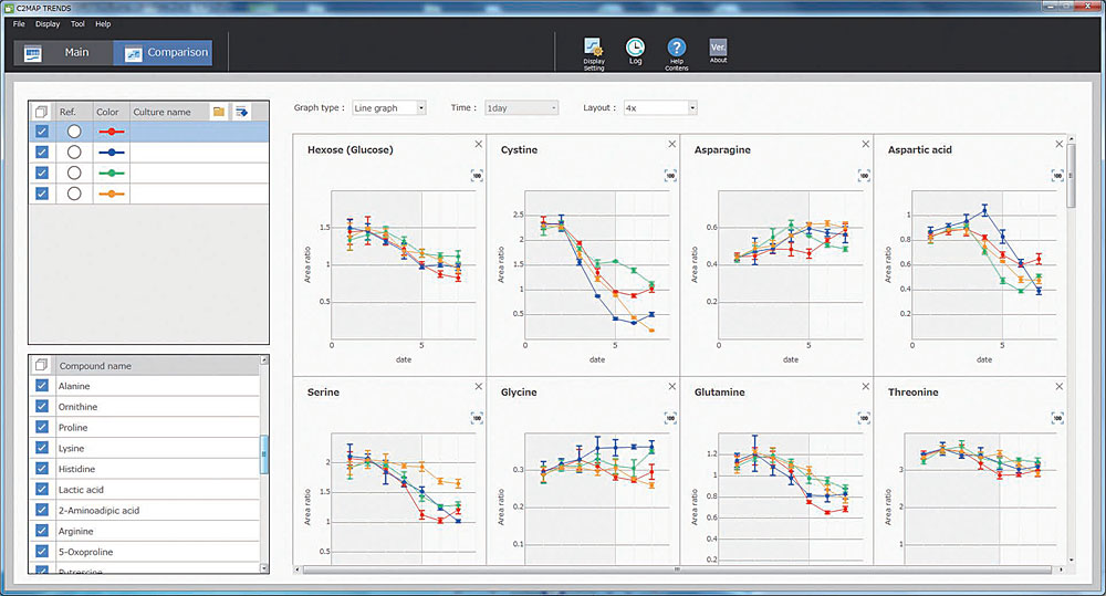 For results obtained via LC/MS/MS, temporal changes in each component can be graphed by the dedicated viewer software. Analysts can monitor variations in metabolites secreted from cells and culture media components during cultivation, as well as display graphs of component comparisons with samples from different culture series. As a result, the consumption and depletion of culture media components, and changes in the amounts of metabolic components secreted from cells, can be observed, thereby providing useful insights into considerations of the optimal culture conditions and assessments of cellular status.