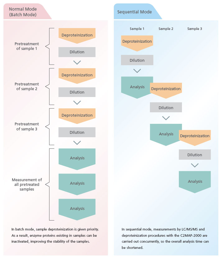 The C2MAP system supports two modes: Batch mode (ordinarily used) that gives priority to the pretreatment of the culture supernatant samples placed, and sequential mode in which pretreatment and analysis are performed alternately for each sample.