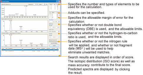 In composition prediction, target constituents having a small mass and high mass accuracy associated with their measured values, provide fewer numbers of candidates and greater prediction reliability. When using information-rich MSn data with the Formula Predictor software, formula predictions starts with the product ion having the smallest mass, and uses that result in the effective prediction of the parent ion by reducing the number of candidates.