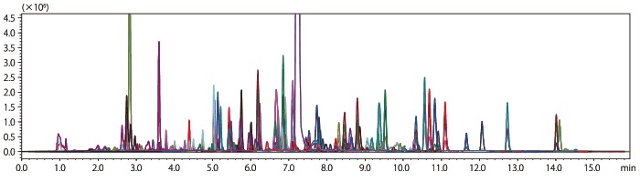 Regulatory agencies worldwide provide oversight for an extensive and ever-increasing list of pesticides in order to promote food safety and protect public health. The MRM chromatogram below shows the simultaneous analysis of 153 pesticides spiked into Codonopsis pilosula at 0.01 mg/kg. Plant matrices can be very challenging due to background interferences, but the LCMS-8045 provides enough sensitivity to analyze most pesticides at the trace level of 10 parts per billion. Many pesticides methods also benefit from polarity switching, which the LCMS-8045 can accomplish in just 5 msec.