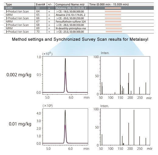 Use Synchronized Survey Scan (SSS) to obtain both qualitative and quantitative information from a single injection. Full scan MS2 spectra will be obtained when an MRM peak intensity threshold is exceeded.
