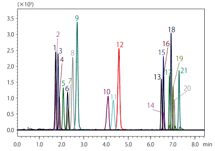 MRM chromatograms of 21 PPCPs (1.0 ng/mL)