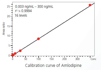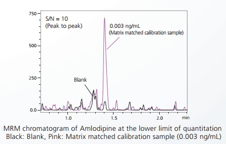 Amlodipine is widely utilized for the treatment of high blood pressure and angina. A high-sensitivity method for the quantitation of amlodipine in human plasma using LCMS-8045 has been developed. Appropriate linearity ranging from 0.03 to 300 ng/mL with excellent accuracy was achieved. Both interday and intraday variabilities were assessed for quality control samples. Percent RSD (Relative Standard Deviation) results were less than 5%.