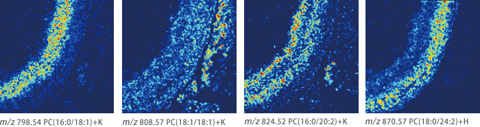 In this experiment, the fat in rat skin was visualized. High spatial resolution imaging clearly showed localization of ceramide in the horny layer and phosphatidylcholine (PC) in the sebaceous gland.