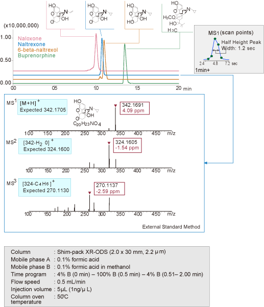 The data above shows the analysis of four compounds within 2.0 minutes. The Auto MSn Function makes it possible to obtain highly accurate MSn data via an external standard, taking advantage of high-speed mass spectrum measurement performance.