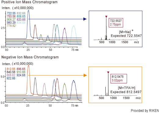 High-speed ion polarity switching can be specially useful when it cannot be judged whether samples will be detected as positive or negative ions. The LCMS-IT-TOF utilizes a newly developed, highly accurate and stable power supply as well as a newly developed high-voltage switch that allows for polarity switching in only 0.1 sec or less (necessary for the sharp HPLC peaks available with the advances in high-speed chromatography). The maximum rate for polarity switching is 2.5 Hz, which allows for a pair of positive and negative ion MS spectra to be obtained 2.5 times per second.