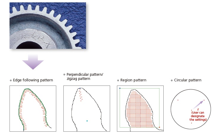 The software automatically detects the sample edges, and then automatically creates a parallel pattern, region pattern, or perpendicular/zigzag pattern.