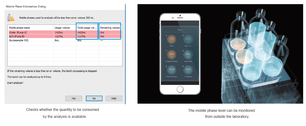 Reservoir tray weight sensors (optional) can be used to monitor the volume of mobile phase or autosampler rinse solution in up to twelve containers. The containers can also be checked remotely from a smart device. You will no longer need to worry about running out of mobile phase mid-analysis, because the device will notify you before starting the run if the volume remaining is too low.