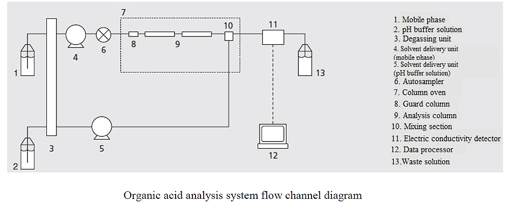 The organic acid system is a highly selective high-sensitivity system. In this system, organic acids are separated using ion exclusion chromatography via Shimadzu’s unique detection technique (pH-buffered electric conductivity detection). Then, a pH-buffering reagent is continuously added to the column eluate in order to keep the pH level at around neutral and dissociate organic acids in order to detect electric conductivity.