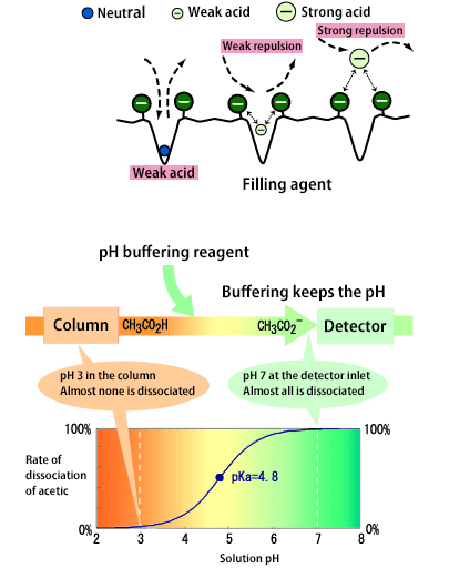 In ion exclusion mode, utilized in organic acid analysis, an H+ cation exchange resin is used as the filling agent. Organic acid, the target component, is separated by the magnitude of Donnan exclusion between the stationary phase surface of the H+ cation exchange group and the mobile phase. In this mode, because of the negative charge on the stationary phase, strong acids experience large electrostatic exclusion, and cannot permeate into the filling agent pores. With organic acids and other weak acids, however, the extent of permeation into the pores is determined by the size of this charge, producing a difference (separation) in elution times. Citric acid and lactic acid, which have a large negative charge (small pKa), experience more electrostatic exclusion than acetic acid, and are eluted faster. In principle, organic acids are all eluted up to the elution position for neutral substances (the position at which the pores are completely permeated), with elution ordered from smallest to largest pKa.