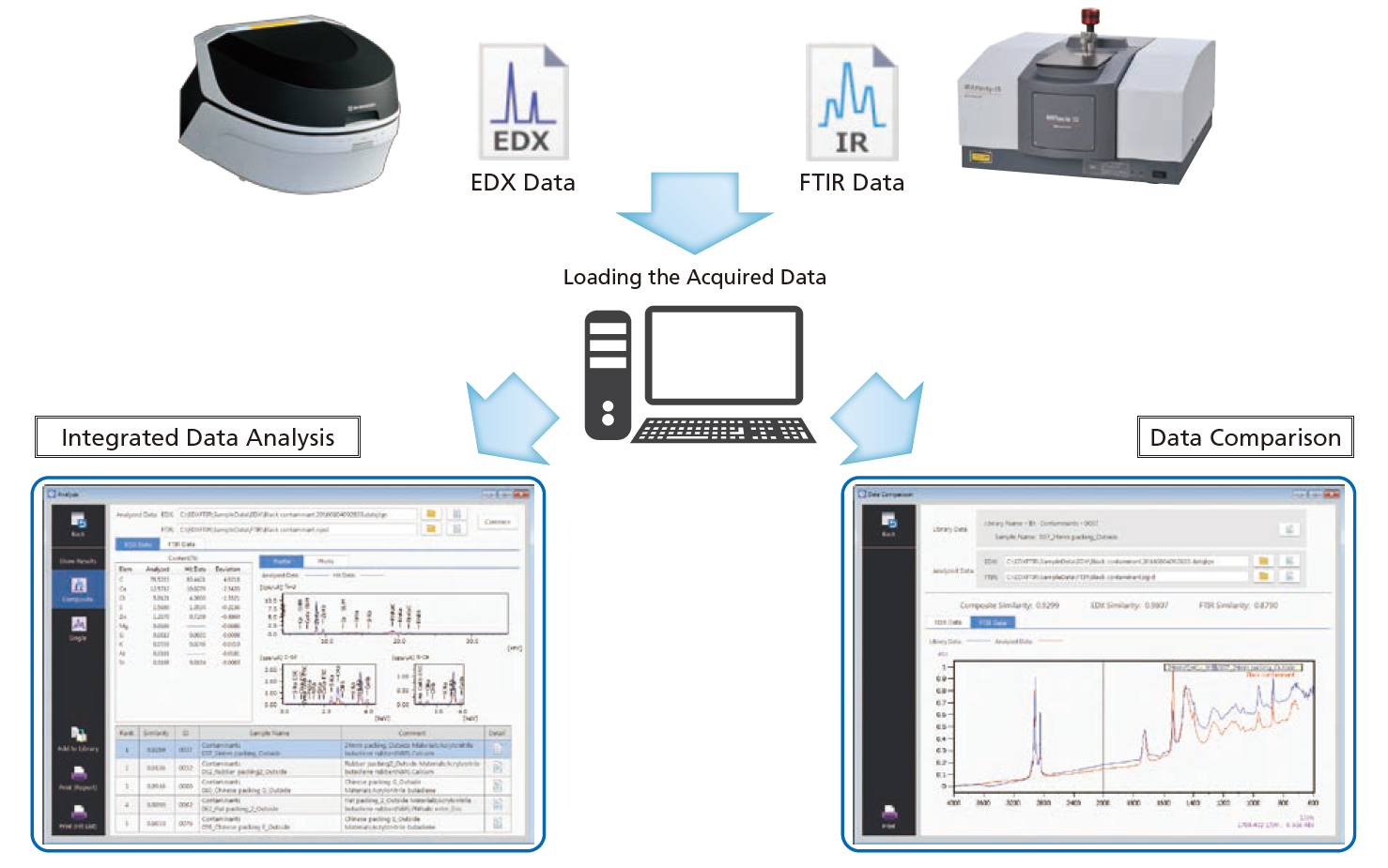In recent years, manufacturers of food and chemicals as well as contract inspection organizations have seen an increased demand for analyses of contaminants. The importance of inspections to determine whether materials conform to specifications and are of the desired quality has also developed. At the same time, increased attention is being focused on EDX, which is suitable for the identification of metals and other inorganic elements, and FTIR, which excels in the analysis of polymeric materials and organic substances. Cases where the same sample is analyzed by both of these instrument types are also growing. However, as well as the need for separate analysis of the data acquired by each instrument, derivations from the data of the two instruments resulting in final identification are essentially left up to the analyst.