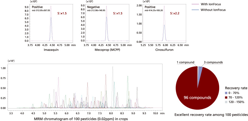 In the newly-developed IonFocus unit, the ion transport electrodes reduce sensitivity loss from matrix effects by expelling neutral matrix particles with greater efficiency. The graphs below show an analysis example of residual pesticides in tea leaves. Using the LCMS-8060NX's world-class polarity reversal speed (5 ms) and data capture speed (1.5 ms), stable data was obtained even for high-speed analysis of multiple components. The IonFocus unit also introduces ions into the detector more efficiently, improving the signal intensity. Of the 100 compounds tested, 96% showed excellent recoveries.