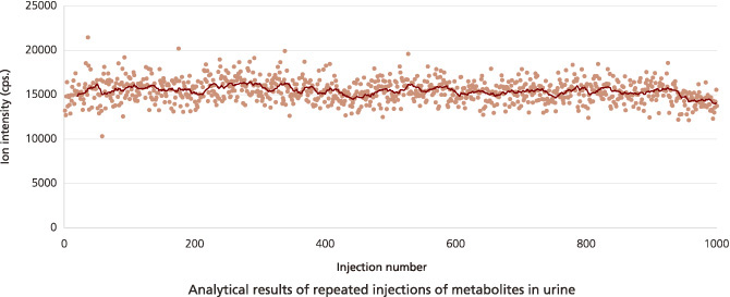 The urine metabolite data shown below provides confidence for the analysis of biological matrices. After the analysis of 1000 urine samples, prepared only by dilution with water, the LCMS-8060NX delivers superior data stability without loss of sensitivity.