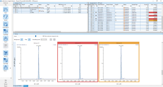 LabSolutions Insight is the ideal environment for sample data review. Toggle between sample and compound review modes based on user preference. The multiple chromatogram display accordingly presents all samples for a particular analyte, or all analytes for a particular sample. All chromatograms can simultaneously be zoomed in or out, or docked in a separate monitor to suit analyst needs.