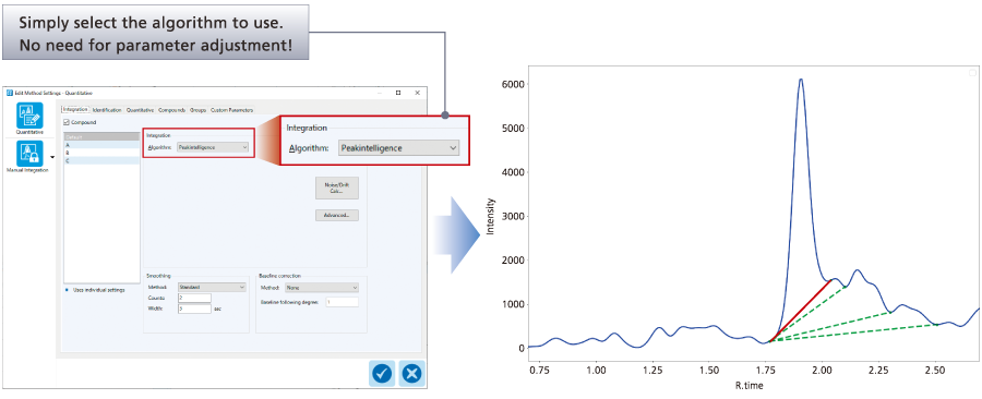 Peakintelligence is a world-first*1 algorithm incorporating AI assistance to search for chromatography peaks. Having learnt peak processing skills from experienced users, the AI can process data with the same skill level. The algorithm can be implemented immediately without adjusting any parameters.*2