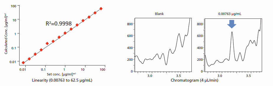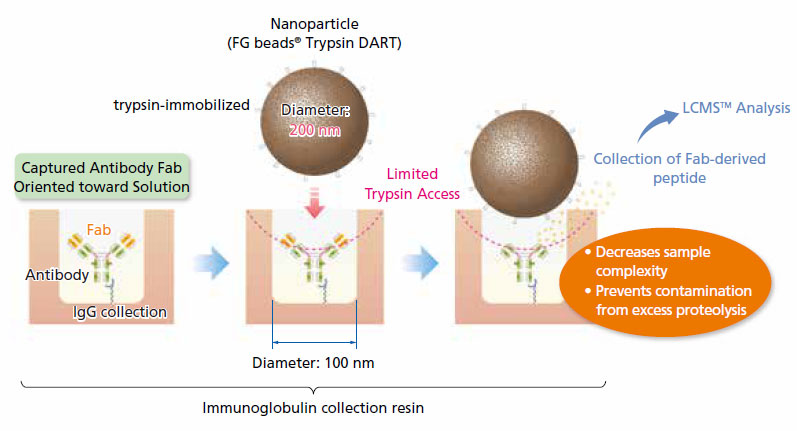 nSMOL (nano-surface and molecular orientation limited proteolysis) is a proprietary, ground-breaking process that enables selective proteolysis of the Fab region of antibodies using trypsin-immobilized nanoparticles. Fab-derived peptides are quantified via MRM measurement on a high-sensitivity mass spectrometer. The Nexera Mikros system achieved signal intensities 12 times higher than with conventional flow rates, with a corresponding lower limit of detection of 0.025 μg/mL and good linearity. The Nexera Mikros system is ideal for low-level quantitation of peptides by LCMS.