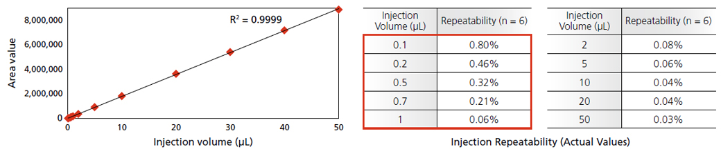 It contributes to produce highly accurate results even if you had to use low injection volume (less than 1 μL). In case of micro flow rate with narrow column, optimum injection volume also gets lowered. It is also difficult to increase the injection volume, especially, if you would use a sample solvent with high elution power. In this case, sample must be diluted to weaken the sample solvents. Highly accurate micro volume injection capability of SIL-40C XR allows you to use samples with high organic solvent contents without dilution.