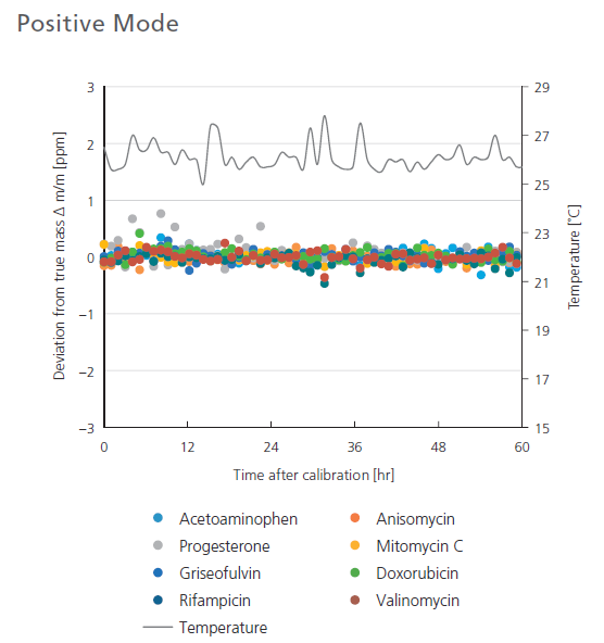 Without additional mass correction, the measured accurate masses of all compounds remained within 1 ppm of the theoretical mass for the 60-hour duration of the experiment. With the LCMS-9030, laboratory productivity can be increased by running long, calibration-free batches with confidence.